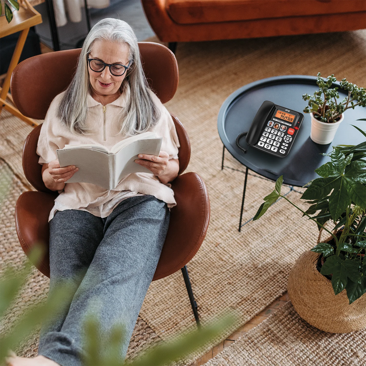 Un teléfono fijo de sobremesa para personas mayores que necesitan letras grandes, teclas claras y un volumen realmente alto, tanto al sonar como al hablar. Pantalla iluminada con identificador de llamadas, compatible con audífonos, amplificador de volumen en llamada (+20dB), botón SOS y memorias directas con foto.