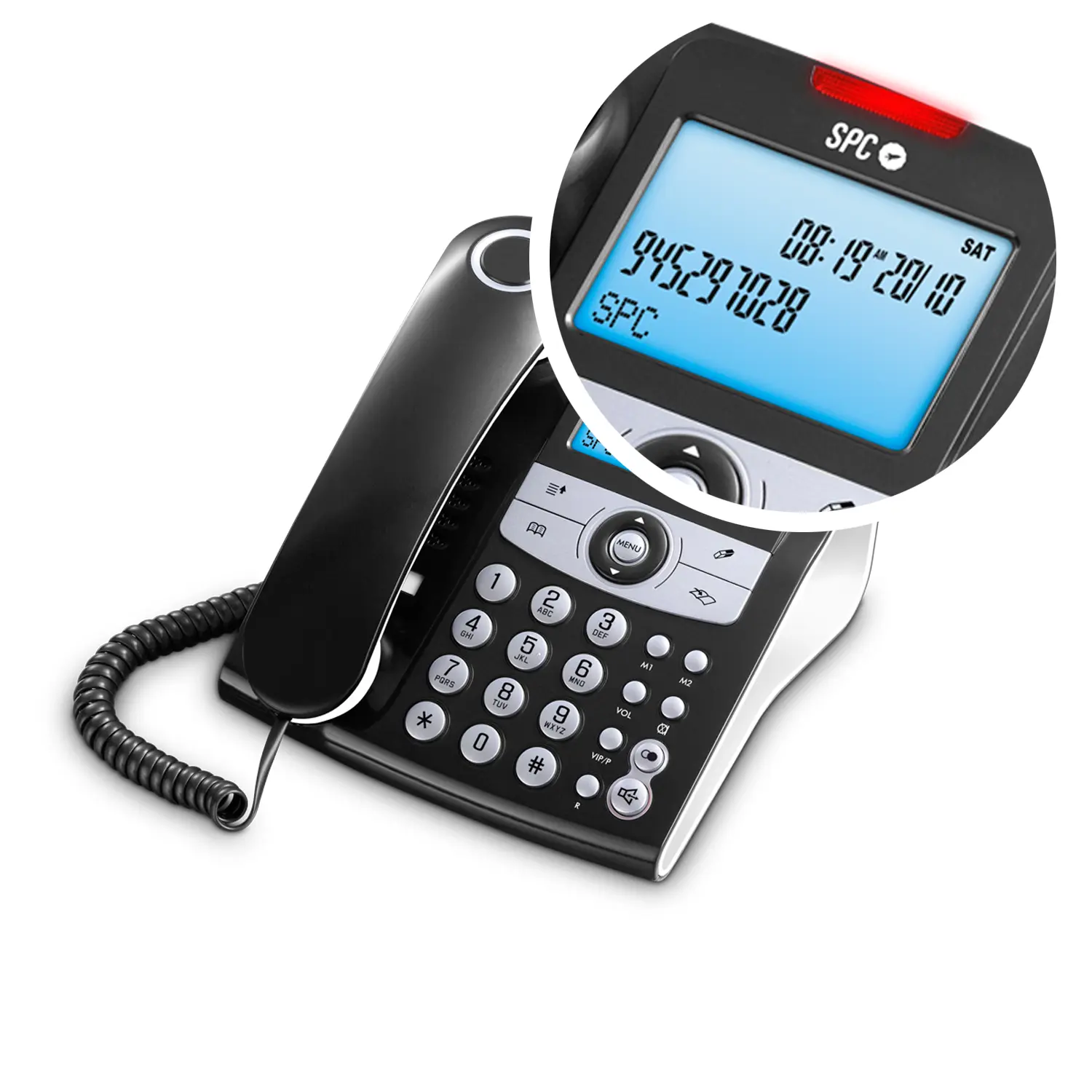 Teléfono fijo de sobremesa elegante y fácil de usar, con pantalla iluminada, identificación de llamadas, 2 memorias directas, agenda y función de manos libres. Pensado para ver quién llama y hablar con comodidad, sin complicaciones.